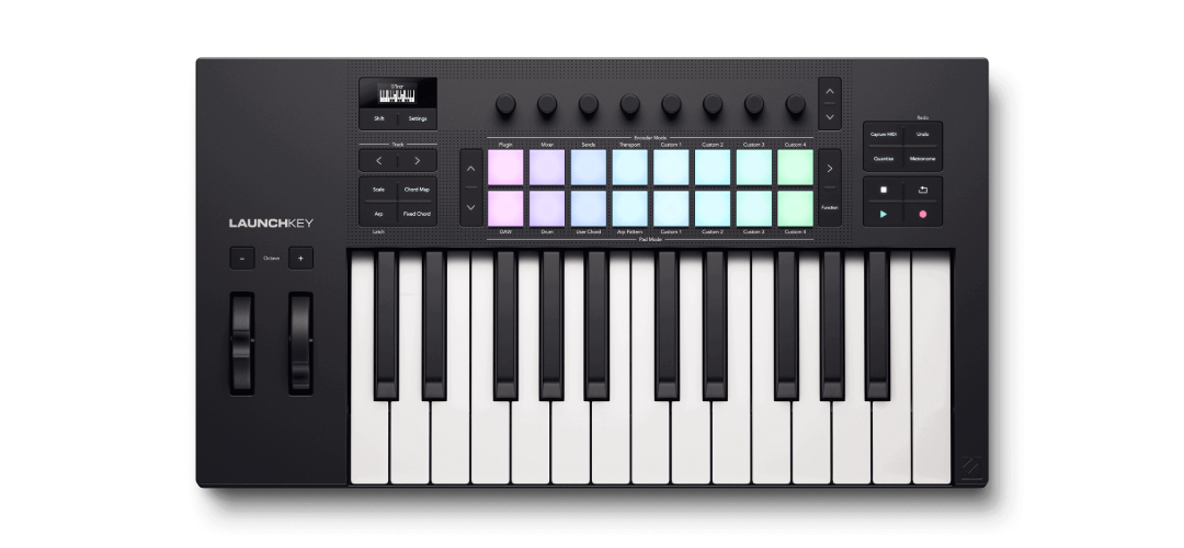 If you want a compact controller that still gives you deep creative features, take a look at the Novation Launchkey 25. It’s a streamlined 25-key controller that fits easily into smaller studio setups, but still delivers full-size control with 16 RGB pads, 8 knobs, transport buttons, scale/chord modes, and powerful arpeggiator tools.